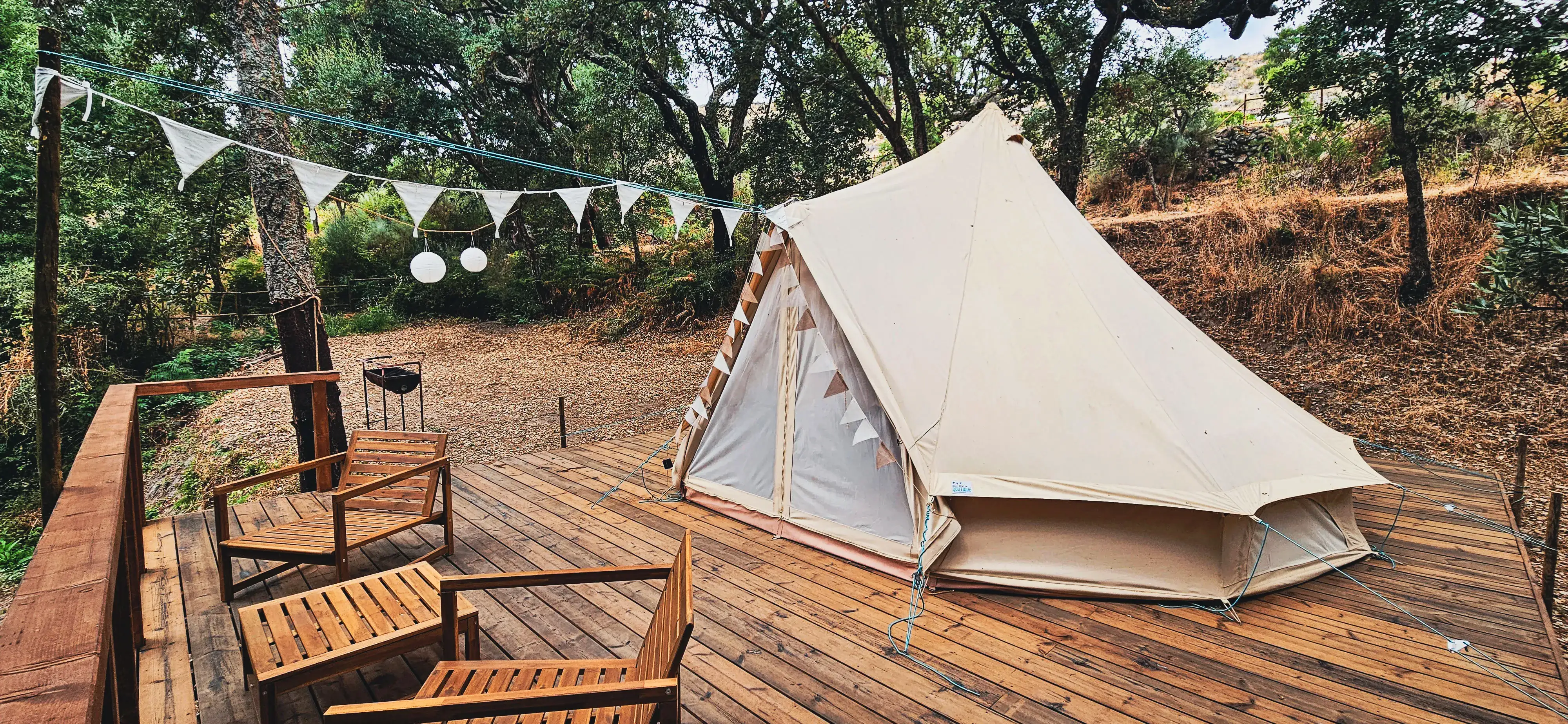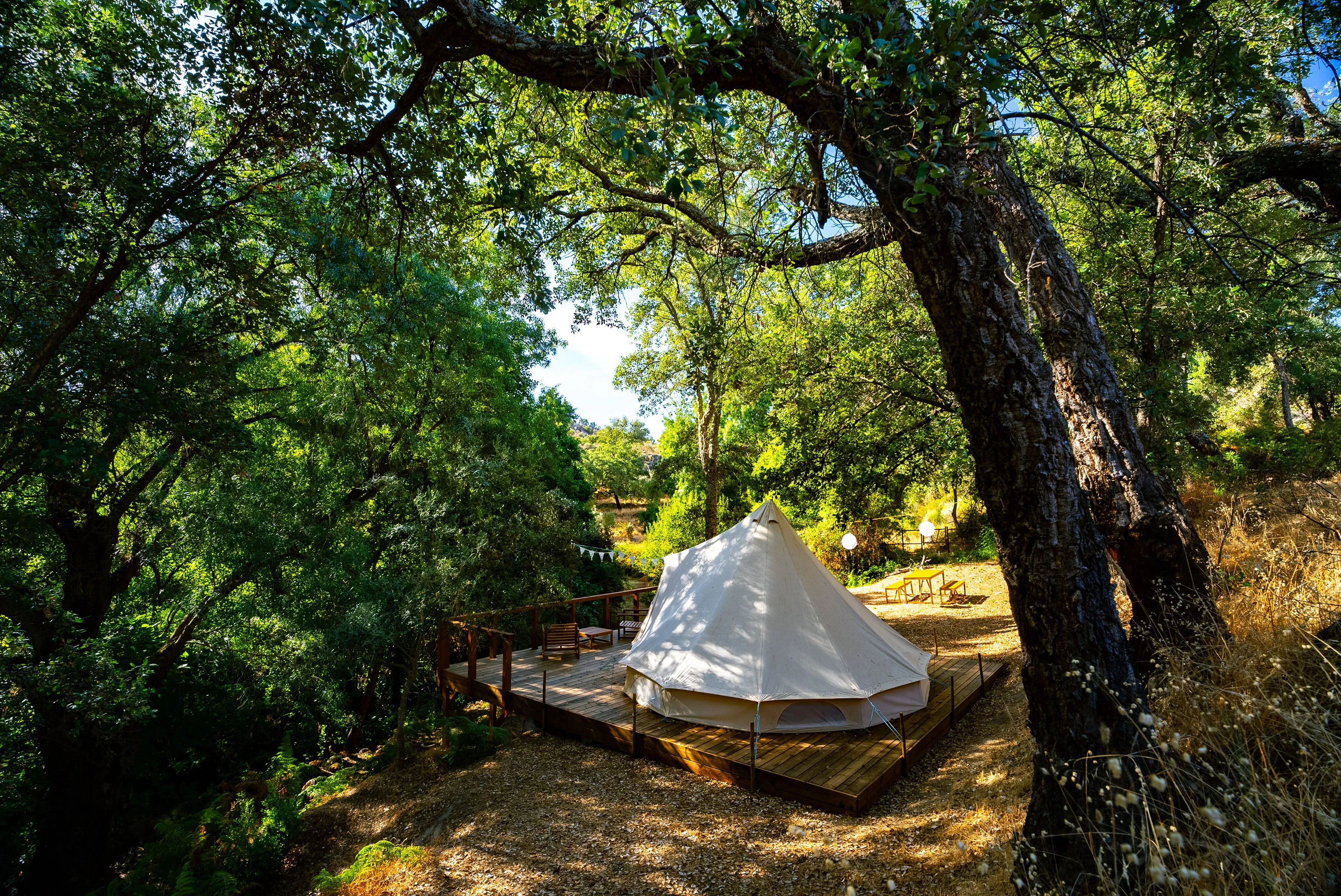 Our bell tent is nestled amongst the wild terraces of olive and fig trees that line our river. You will be off-grid, but with solar lighting and USB charging, so if wild camping is for you, why not allow yourself a little bit of luxury on your Portuguese adventure.